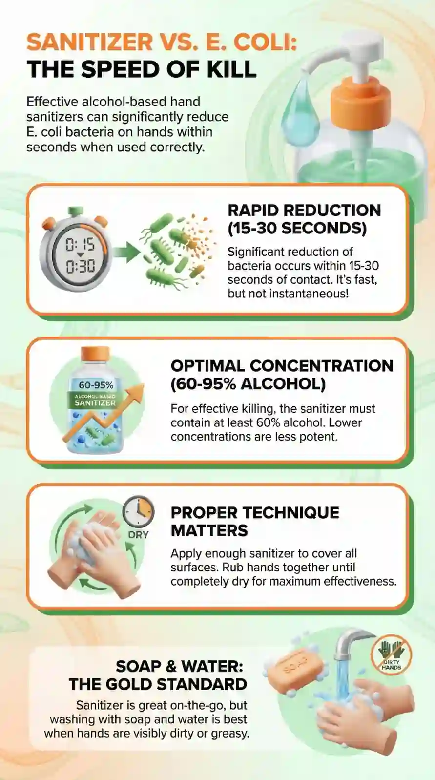 Alcohol Concentration Products with 60-70% alcohol require 5-15 minutes for complete E. coli kill. Formulations with 75-80% alcohol work faster, achieving bacterial elimination in 1-5 minutes. Sanitizers below 60% alcohol may only reduce bacterial growth rather than kill E. coli outright.