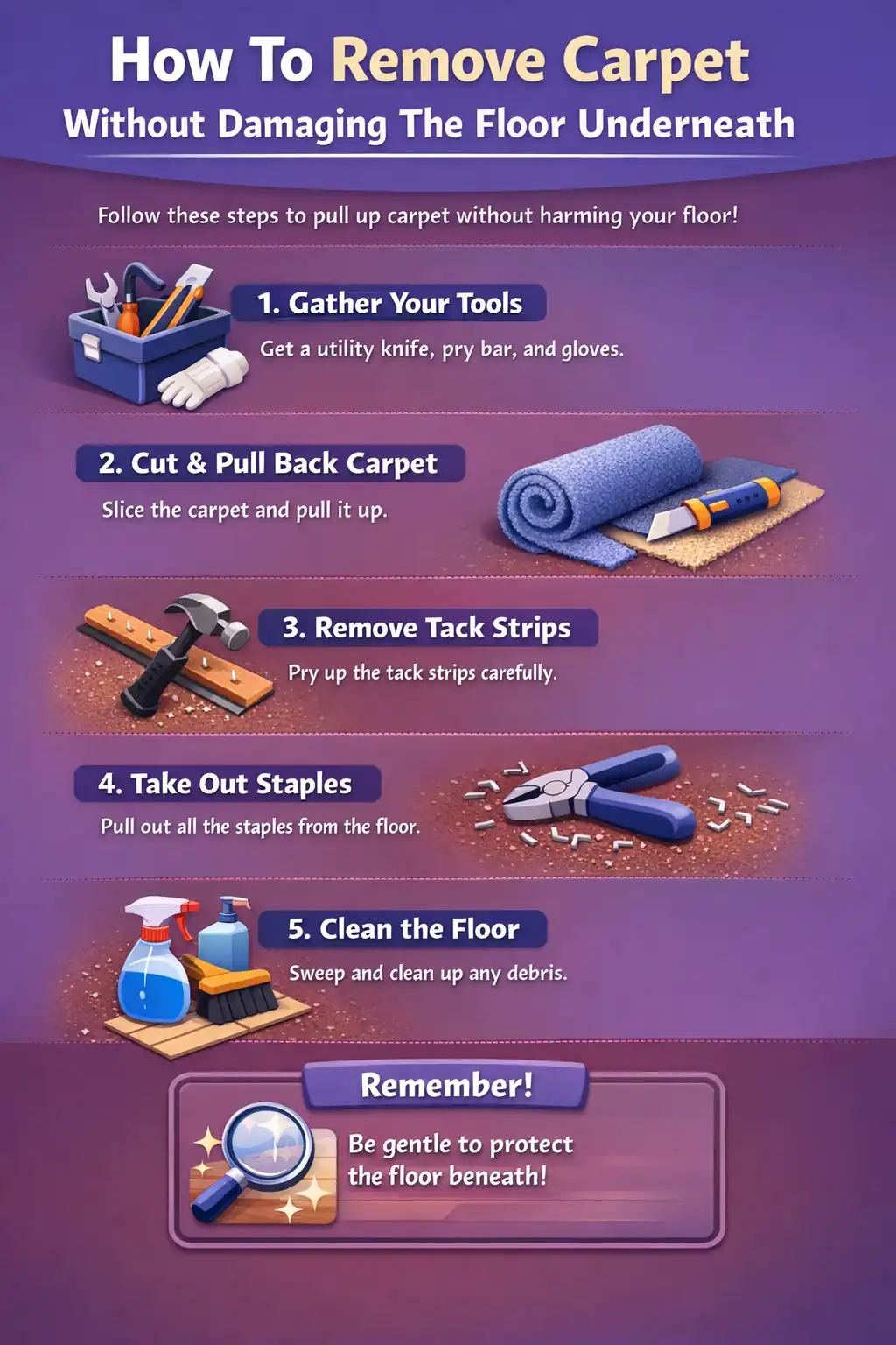 Once the carpet is gone, carefully remove remaining fasteners and adhesive. Rushing this step can undo all your careful work. Slow cleanup preserves the finish and prepares the surface for its next use.