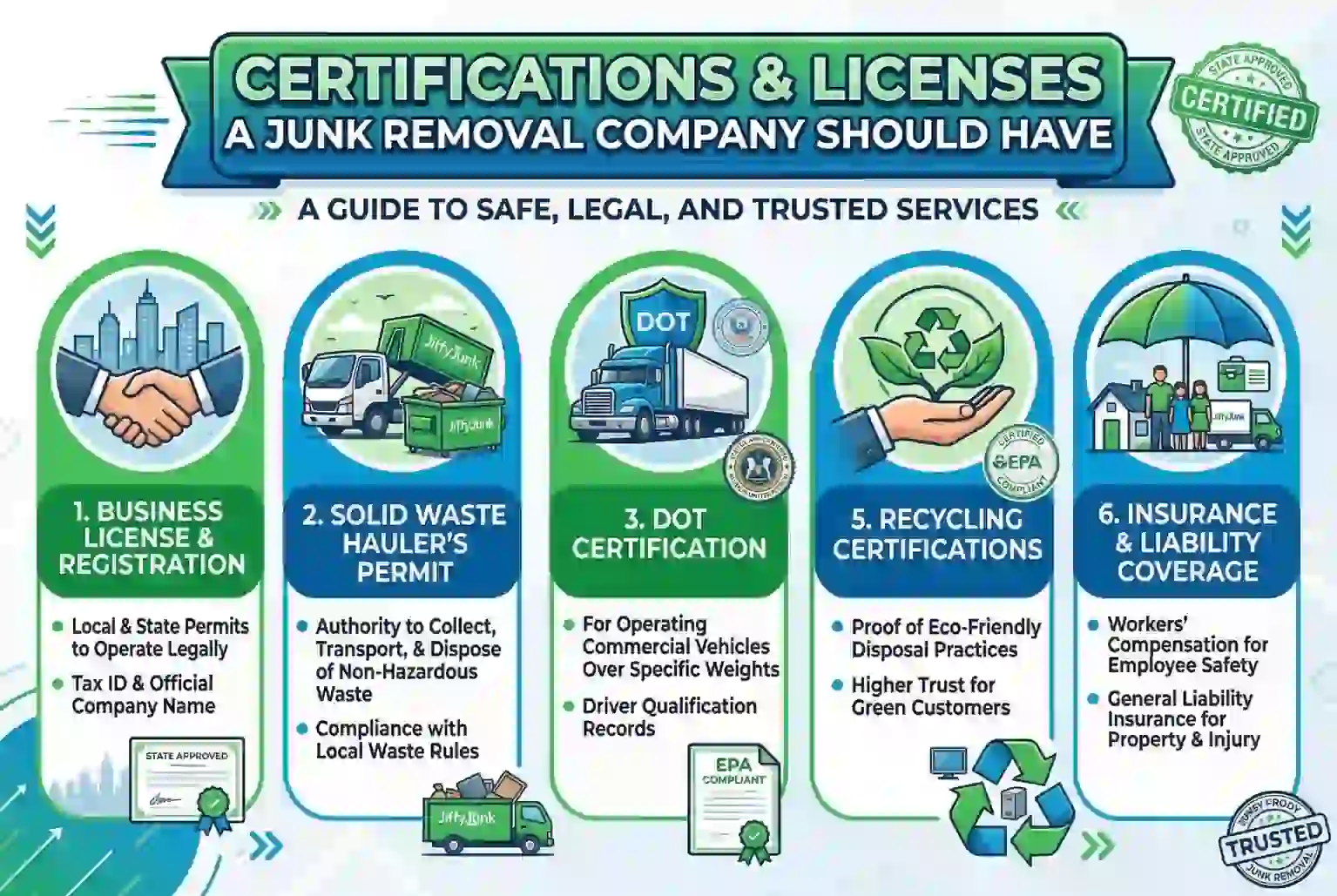 Most people assume that if a junk removal company is in business, it must be operating legally. That assumption gets customers into trouble every day. In our experience at Jiffy Junk, the companies that cut corners on licensing are the same ones that cut corners on the job — and when something goes wrong, there is no safety net for the customer. Credentials are not just paperwork. They are proof that a company has met the legal, financial, and operational standards required to work on your property.